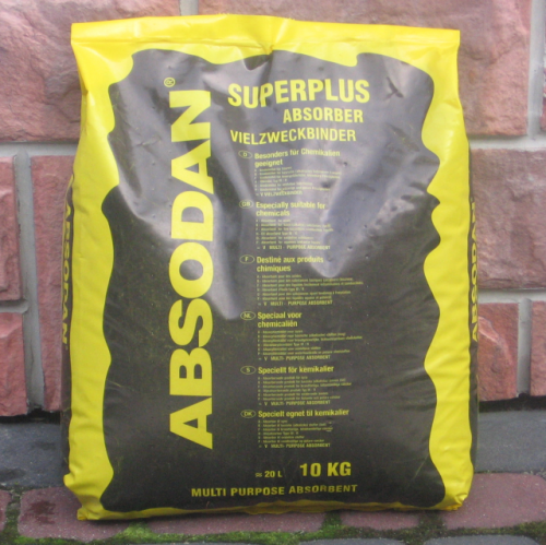Absodan Super Plus – drobnoziarnisty (0.3 – 1mm) granulat mineralny. Szczególnie przydatny do rozlanych chemikaliów i wszędzie tam gdzie wymagany jest duży kontakt z powierzchnią i szybkie pochłanianie. Zdolność sorpcyjna ponad 100%. Możliwość wielokrotnego użycia. Bezpieczny dla środowiska w stanie czystym. Chłonie wszystkie rodzaje cieczy. Nie wymaga oznakowania dla celów transportowych.